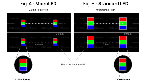 Micro LED 在同样的像素间距下,像素尺寸更小、排列更密集